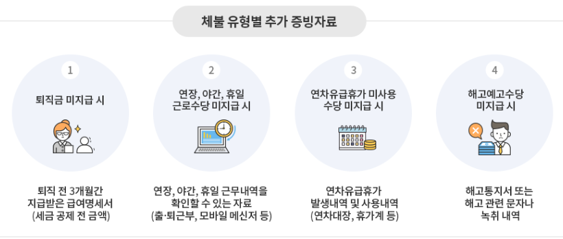 - ์ฆ๊ฑฐ ์๋ฃ ํ๋ณด: ๊ทผ๋ก๊ณ์ฝ์, ๊ธ์ฌ๋ช ์ธ์, ์๊ธ ์ง๊ธ ๋ด์ญ ๋ฑ ์ฆ๊ฑฐ ์๋ฃ๋ฅผ ํ๋ณดํฉ๋๋ค.