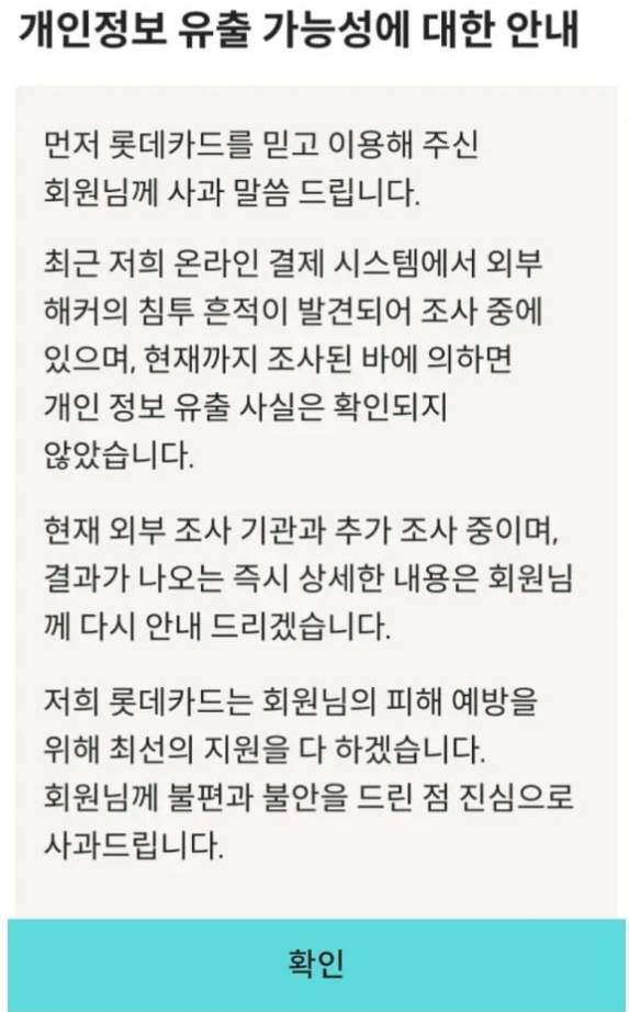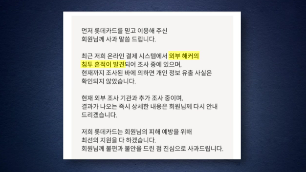 ๋กฏ๋ฐ์นด๋ ์ธก์ ํดํน ์๋๋ฅผ ํ์ ํ ์งํ ์์คํ ์ ์ ๊ฒํ๊ณ , ์ถ๊ฐ์ ์ธ ํผํด๋ฅผ ๋ง๊ธฐ ์ํ ๋์์ ์งํ ์ค์ ๋๋ค. ํ์ง๋ง ์์ง ์์ ํ ์์ฌํ๊ธฐ๋ ์ด๋ฅด๋ฏ๋ก, ์ต๊ทผ ์นด๋ ๊ฒฐ์ ๋ด์ญ์ ๋ฏธ์น์ธ ๊ฑฐ๋๋ ๋น์ ์์ ์ธ ์ฌ์ฉ ๋ด์ญ์ด ์๋์ง ๋ฐ๋์ ํ์ธํด์ผ ํฉ๋๋ค. ๋ง์ฝ ์์ฌ์ค๋ฌ์ด ๊ฑฐ๋๋ฅผ ๋ฐ๊ฒฌํ๋ค๋ฉด ์ฆ์ ๋กฏ๋ฐ์นด๋ ๊ณ ๊ฐ์ผํฐ์ ์ ๊ณ ํ๊ณ , ํด๋น ์นด๋๋ฅผ ์ ์ง์ํค๋ ๊ฒ์ด ์ต์ฐ์ ์ ๋๋ค.