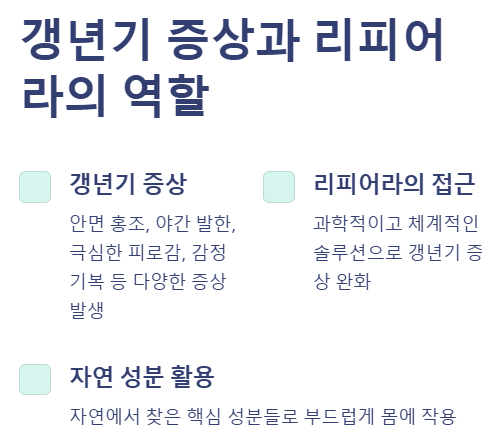๋ฆฌํผ์ด๋ผ ํจ๋ฅ๊ณผ ์ฑ๋ถ, (๊ฐฑ๋ ๊ธฐ ์ฌ์ฑ์ ๊ฑด๊ฐ์ ์งํค๋ ๋น๋ฐ)