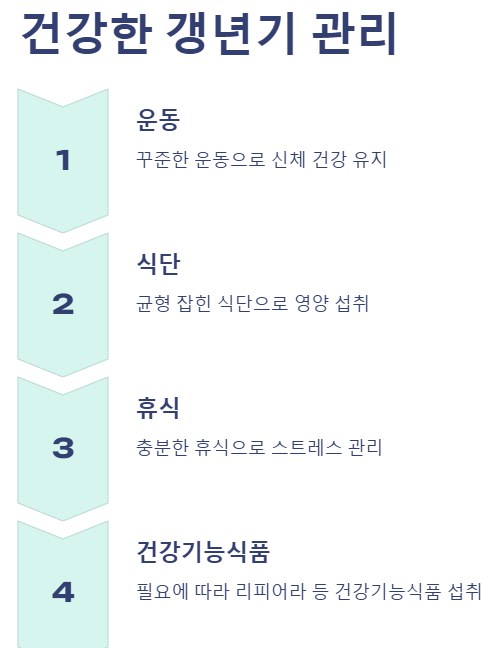 ๊ฒฐ๋ก ์ ์ผ๋ก, ๊ฐฑ๋ ๊ธฐ๋ ๋จ๋ ๋ชจ๋์๊ฒ ์ฐพ์์ค๋ ์์ฐ์ค๋ฌ์ด ๋ณํ์ ์๊ธฐ์ ๋๋ค. ๊พธ์คํ ์ด๋, ๊ท ํ ์กํ ์๋จ, ์ถฉ๋ถํ ํด์์ ํตํด ๊ฑด๊ฐํ ๊ฐฑ๋ ๊ธฐ๋ฅผ ๋ณด๋ด๊ณ , ํ์์ ๋ฐ๋ผ ๊ฑด๊ฐ๊ธฐ๋ฅ์ํ์ ๋์์ ๋ฐ๋๋ค๋ฉด, ๋์ฑ ํ๊ธฐ์ฐจ๊ณ ํ๋ณตํ ์ถ์ ๋๋ฆด ์ ์์ ๊ฒ์ ๋๋ค.