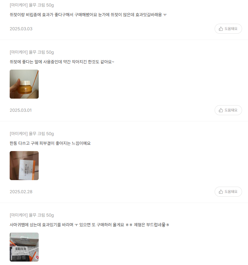 - ๋ฐ ๋: "์ฌ๋ง๊ท ๋๋ฌธ์ ์๋๋ฐ ํจ๊ณผ ์๊ธฐ๋ฅผ ๋ฐ๋ผ๋ฉฐ... ํจ๊ณผ ์์ผ๋ฉด ๋ ๊ตฌ๋งคํ๋ฌ ์ฌ๊ฒ์. ์ ํ์ ๋ถ๋๋ฝ๋ค์."