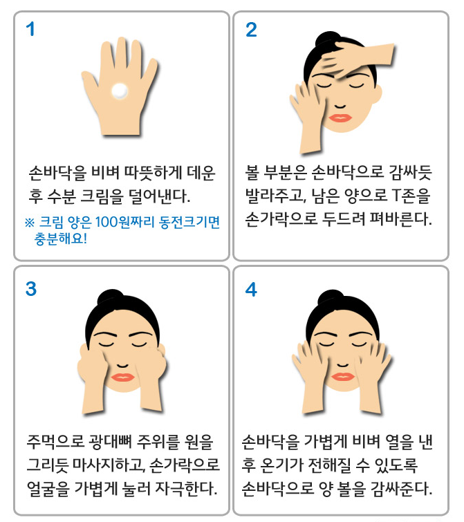 ์ด์ ๋ณธ๊ฒฉ์ ์ผ๋ก ์ผ๊ตด์ ๋ฐ๋ผ๋ณผ ์ฐจ๋ก์ ๋๋ค. ํฌ๋ฆผ์ ์ผ๊ตด ์ค์๋ถํฐ ๋ฐ๊นฅ์ชฝ์ผ๋ก ํด ๋ฐ๋ฅด๋ ๊ฒ์ด ์ข์ต๋๋ค. ์ด๋ง์ ์ฝ๋ฅผ ์์์ผ๋ก ์ ๋ณผ, ๊ทธ๋ฆฌ๊ณ ํฑ ์์๋ก ๋ถ๋๋ฝ๊ฒ ๋ํฌํด ์ฃผ์ธ์. ํฌ๋ฆผ์ ๋ค ๋ฐ๋ฅธ ํ์๋ ์๊ฐ๋ฝ ๋์ผ๋ก ํผ๋ถ๋ฅผ ๋ถ๋๋ฝ๊ฒ ๋ง์ฌ์งํด์ฃผ๋ฉด ํก์์จ์ ๋์ฑ ๋์ผ ์ ์์ต๋๋ค. ๋ง์ง๋ง์ผ๋ก, ๋ง์ ๋ถ๋ค์ด ๊ฐ๊ณผํ๊ธฐ ์ฌ์ด ๋ชฉ๊ณผ ๋๊ฐ์๋ ์์ง ์๊ณ ์๋ถํฌ๋ฆผ์ ๋ฐ๋ผ์ฃผ์ธ์. ํนํ ๋๊ฐ๋ ํผ๋ถ๊ฐ ์๊ณ ๊ฑด์กฐํ๊ธฐ ์ฌ์ฐ๋ฏ๋ก ๋์ฑ ์ ๊ฒฝ ์จ์ฃผ๋ ๊ฒ์ด ์ข์ต๋๋ค. ์์ ๋ฐ๋ปํ ์จ๊ธฐ๋ฅผ ์ด์ฉํด ์ง๊ทธ์ ๋๋ฌ์ฃผ๋ฉด ํฌ๋ฆผ์ด ํผ๋ถ ๊น์์ด ์ค๋ฉฐ๋๋ ๋ฐ ๋์์ด ๋๋ต๋๋ค. ์ด๋ฌํ ๊ณผ์ ์ ํตํด ์ฌ๋ฌ๋ถ์ ํผ๋ถ๋ ์๋ถ์ ์ถฉ๋ถํ ๋จธ๊ธ๊ณ ๋์ฑ ๊ฑด๊ฐํด์ง ์ ์์ต๋๋ค.