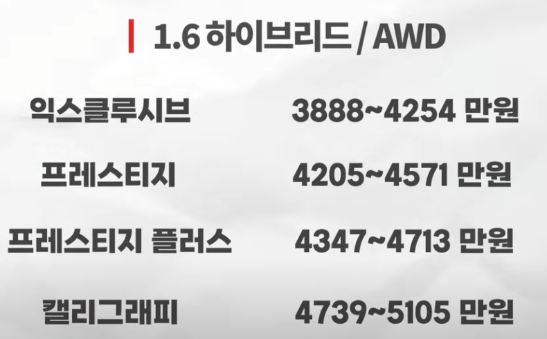 ๊ธฐ๋ณธ ๊ฐ๊ฒฉ: 4,347๋ง ์ (4WD 20์ธ์น ํ , ํ์ด์ด ์ ์ธ)