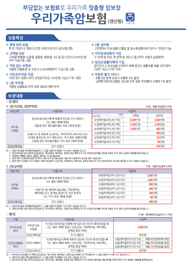 - ๊ฐ์กฑํ ์๋ณดํ: ๊ฐ์ธ๋ฟ๋ง ์๋๋ผ ๋ฐฐ์ฐ์๊น์ง ํจ๊ป ๋ณด์ฅ๋ฐ์ ์ ์๋ ์ํ์ ๋๋ค. ๊ฐ๋ณ์ ์ธ ๋ณด์ฅ ์ต์ ์ ํ์ด ๊ฐ๋ฅํ๋ฉฐ, ๊ฐ ๊ฐ์กฑ ๊ตฌ์ฑ์์ ์ฐ๋ น์ ๋ฐ๋ผ ๋ณดํ๋ฃ๊ฐ ๋ค๋ฅด๊ฒ ์ฑ ์ ๋์ด ๋ง์ถคํ ์ค๊ณ๋ฅผ ์ ๊ณตํฉ๋๋ค.
