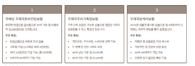 ์ฐ์ฒด๊ตญ์ ๊ณ ๊ฐ์ ๋ค์ํ ํ์์ ๋ง์ถฐ ์ฌ๋ฌ ์ ํ์ ์๋ณดํ ์ํ์ ์ ๊ณตํฉ๋๋ค. ํนํ, ๋น๊ฐฑ์ ํ ์ํ๋ค์ ๋ค์๊ณผ ๊ฐ์ ํน์ง์ ๋ฐํ์ผ๋ก ์ค๊ณ๋์์ต๋๋ค.