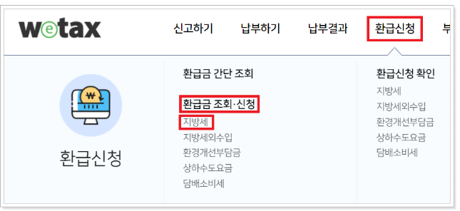 λ¨Όμ , μ§λ°©μΈ λ©λΆ λ° νκΈ κ΄λ ¨ 곡μ μΉμ¬μ΄νΈμΈ μνμ€(WETAX) ννμ΄μ§μ μ μν΄μΌ ν©λλ€. λ‘κ·ΈμΈ ν λ©μΈ νλ©΄μ΄λ λ©λ΄μμ 'νκΈκΈ μ‘°ν·μ μ²' λ©λ΄λ₯Ό μ°Ύμ ν΄λ¦ν©λλ€.