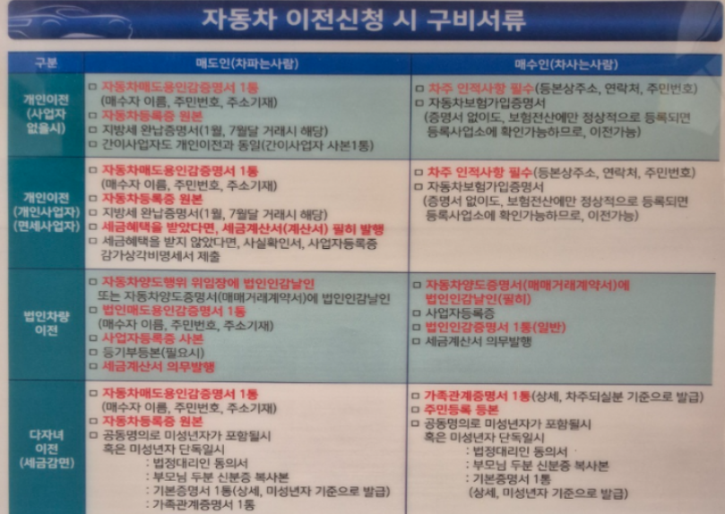 κΈ°λ³Έμ μΌλ‘ λ§€λμΈκ³Ό λ§€μμΈ λͺ¨λ λΉμ¬μ μ κΈ°μ€μ ν΄λΉνλ μλ₯λ₯Ό μ€λΉνμλ©΄ λ©λλ€. μ¦, λ§€λμΈμ μλμ°¨ λ§€λμ© μΈκ°μ¦λͺ μμ μλμ°¨ λ±λ‘μ¦, κ·Έλ¦¬κ³ 1μ/7μ μ§λ°©μΈ μλ© μ¦λͺ μ λ±μ μ€λΉν΄μΌ νλ©°, λ§€μμΈμ λ³ΈμΈ μ λΆμ¦κ³Ό μλμ°¨ 보ν κ°μ μ μλ£ν΄μΌ ν©λλ€.