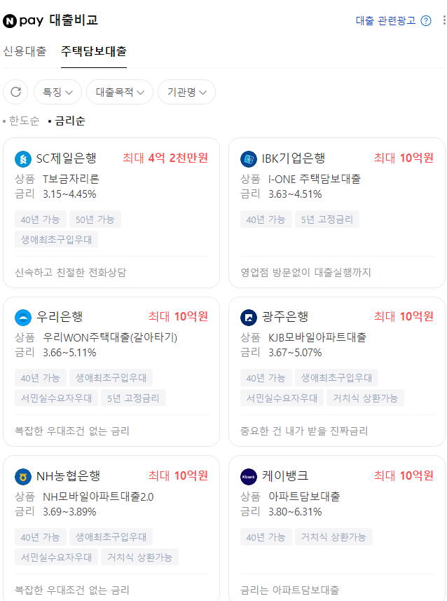 ๋ค์ด๋ฒ๊ฒ์์ผ๋ก ์ฃผํ๋ด๋ณด๋์ถ ๊ธ๋ฆฌ๊ต๋ผ๊ณ ์ฌ์ดํธ์ ๊ฒ์ํ๋ฉด ๊ธ๋ฆฌ์ ๋ํ ์ ๋ณด๊ฐ ํ๋์ ๋์ต๋๋ค. ์ํ๋ณ๋ก ๋ด๊ฐ ์ํ๋ ์ํ์ ์ค์ ํ๋ฉด ๋์ถ์ํ๋ช ํ๊ณ ๊ธ๋ฆฌ ์ต๋๊ธ์ก๊น์ง ํ๊ธฐ์ฌ ๋์ด ๋์ต๋๋ค. ๋ณดํต ์ฃผ๊ฑฐ๋ ์ํ์ ๋ง์ด ์ด์ฉํ๋๋ฐ ์ฃผ๊ฑฐ๋์ํ์ด ์๋ ์ํ๋ ์ค์ ํด์ ํ์ธํ ์ ์์์ต๋๋ค. ์ ๊ฐ ์ค์ ํด์ ๋ณด๋ SC์ ์ผ์ํ์ด ์ ์ผ ๊ธ๋ฆฌ๊ฐ ๋ฎ์ ๊ฒ์ ํ์ธํ ์ ์์์ต๋๋ค.